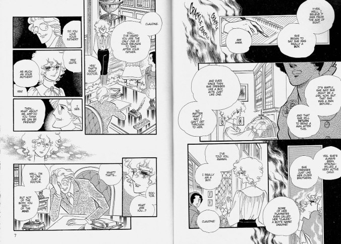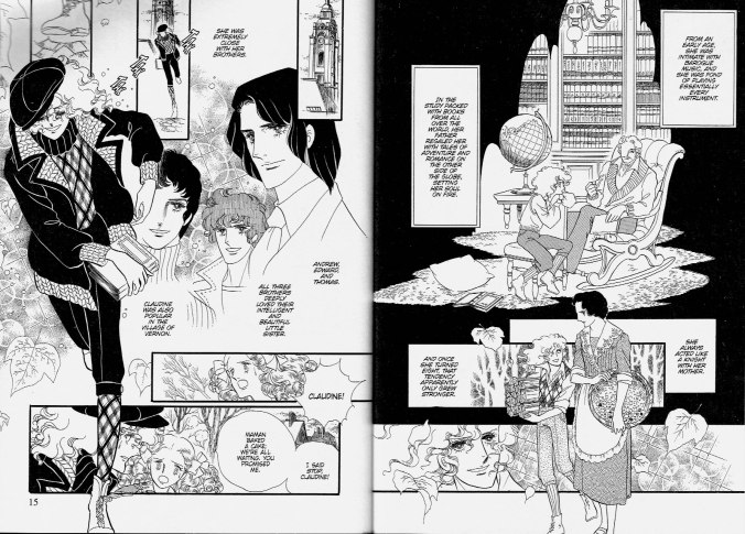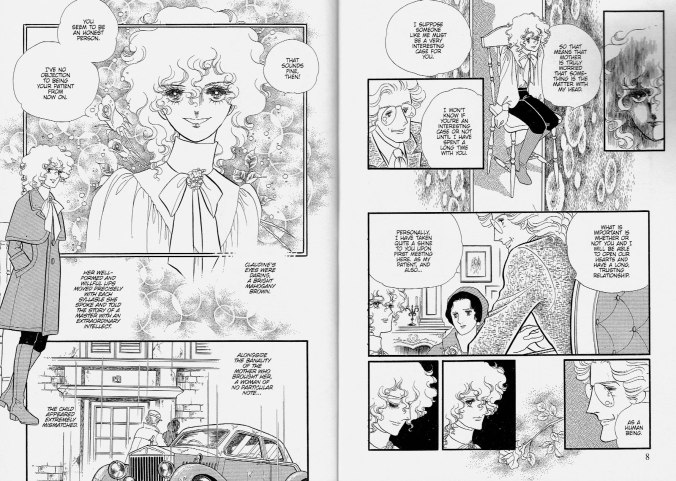 J’ai déjà beaucoup parlé de la place importante du Groupe de  l’an 24 dans le manga lors de mon commentaire sur Le coeur de Thomas par Moto Hagio. De plus, la “Postface” du manga (pp. 462-63), par Josselin Moneyron (directeur éditorial de Kazé Manga en 2013), nous introduit très brièvement au Groupe de l’an 24 (notamment composé de Moto Hagio et Riyoko Ikeda) qui a redéfinit tous les codes du manga shōjo moderne. “À partir d’un style visuel qui rappelle le dessin de mode, elles construisent des planches à la mise en page éclatée, bien plus expressionniste  et symboliste que réaliste. (…) Les décors disparaissent pour laisser la place à des représentations des émotions ressenties qui bordent à l’abstraction. (…) Ikeda met en scène un monde d’âmes torturées, d’amours ambiguës, d’où transpire sa vision libertaire de l’existence. (…) elle représente ici une élite en pleine déliquescence, enfermée dans une univers “laid et froid“, et glorifie les personnages qui, en marge de ce modèle dominant et malgré leurs violentes névroses, essaient de vivres libres, d’aimer en paix.“ Écrit en 1975, juste après la parution de La Rose de Versailles, Très cher frère… apparait dans l’oeuvre de Ikeda comme le pendant féminin au Coeur de Thomas de Moto Hagio (publié à la même époque) qui présentait une intrigue romantique similaire mais se déroulant dans un pensionnat pour jeunes garçons.