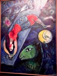 En fin de semaine j’ai finalement réussi à visiter l’exposition Chagall au Musée des Beaux-Arts avant qu’elle ne se termine. D’habitude je ne suis pas trop fervent d’art moderne mais je dois avoué avoir été surpris par celle-ci. Marc Chagall est juste assez figuratif pour que je l’apprécie. Il a une palette de couleurs attrayante et ses sujets sont très révélateurs de la culture qui l’a nourrie (il était juif hassidique russe). Étrangement, les thématiques récurrentes dans son oeuvre semblent correspondre aux instruments à cordes (violons, mandolines), au coq et au cirque! C’est un artiste très polyvalent qui a touché à pratiquement tout les media, de la peinture à la sculpture, aux fresques et aux vitraux, de même qu’à la céramique ainsi qu’aux décors et costumes de scènes…