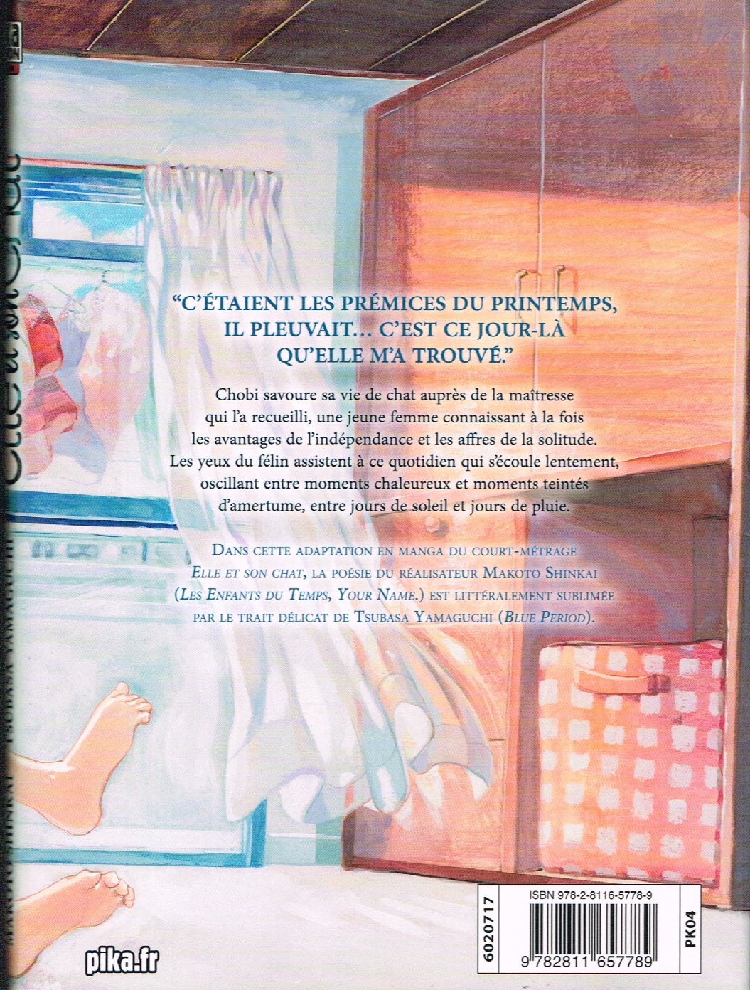 Elle et son chat par Makoto Shinkai (scénario) & Tsubasa Yamaguchi (dessin). Vanves: Pika Édition (Coll. Pika Seinen), septembre 2021. 164 pages, 13.3 x 18.1 cm, 7 € 50 / 12,95 $Can, ISBN 978-2-8116-5778-9. Pour un lectorat adolescent (13+). stars-3-0