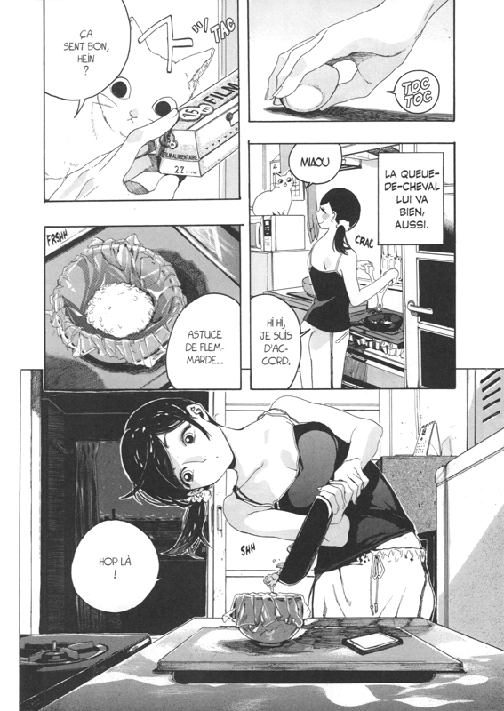 ElleEtSonChat-cov“Chobi savoure sa vie de chat auprès de la maîtresse qui l’a recueilli, une jeune femme connaissant à la fois les avantages de l’indépendance et les affres de la solitude.  Les yeux du félin assistent à ce quotidien qui s’écoule lentement, oscillant entre moments chaleureux et moments teintés d’amertume, entre jours de soleil et jours de pluie.