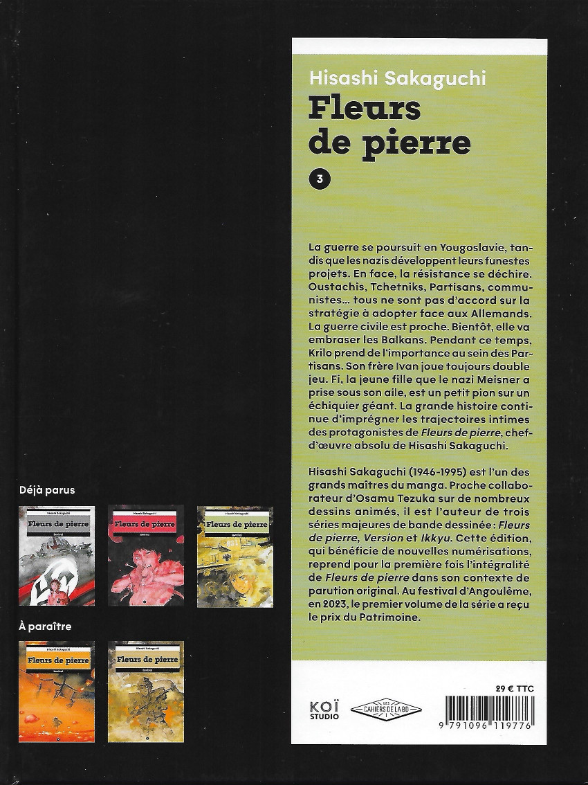 La guerre se poursuit en Yougoslavie, tandis que les nazis développent leurs funestes projets. En face, la résistance se déchire. Oustachis, Tchetniks, Partisans, communistes… tous ne sont pas d’accord sur la stratégie à adopter face aux Allemands. La guerre civile est proche. Bientôt, elle va embraser les Balkans. Pendant ce temps, Krilo prend de l’importance au sein des Partisans. Son frère Ivan joue toujours double jeu. Fi, la jeune fille que le nazi Meisner a prise sous son aile, est un petit pion sur un échiquier géant. La grande histoire continue d’imprégner les trajectoires intimes des protagonistes de Fleurs de pierre, chef-d’œuvre absolu de Hisashi Sakaguchi. [Texte de la couverture arrière]
