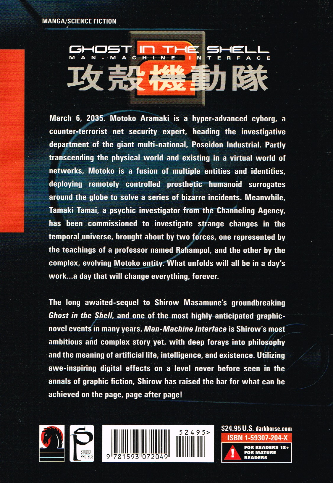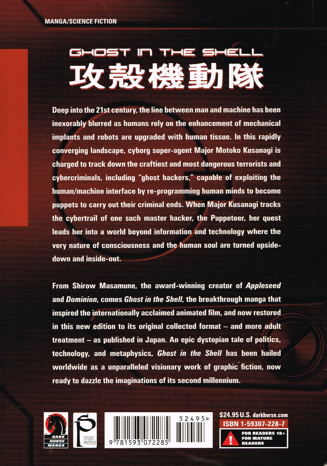 “Volume 1: No mission too dangerous. No case too cold. When a high-ranking government official is kidnapped, the Prime Minister must call in his top crime fighting force known as Section 9. Led by the beautiful (and deadly) Major Kusanagi, the cybernetically enhanced squad must use all their skill to take down the kidnappers and rescue the hostages. But that’s only half of the mission; can Kusanagi and company find out who’s behind the kidnapping, and, more importantly, just what they’re after? Find out in this thrilling first volume of The Ghost in the Shell: Stand Alone Complex!”