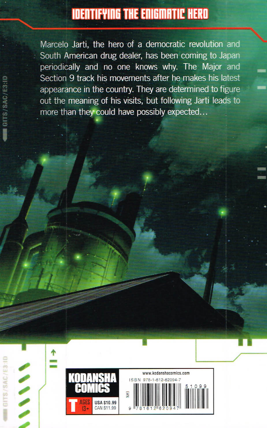 “Volume 3: Identifying the enigmatic hero. Marcelo Jarti, the hero of a democratic revolution, and South American drug dealer, has been coming to Japan periodically and no one knows why. The Major and Section 9 track his movements after he makes his latest appearance in the country. They are determined to figure out the meaning of his visits, but following Jarti leads to more than they could have possibly expected …”
