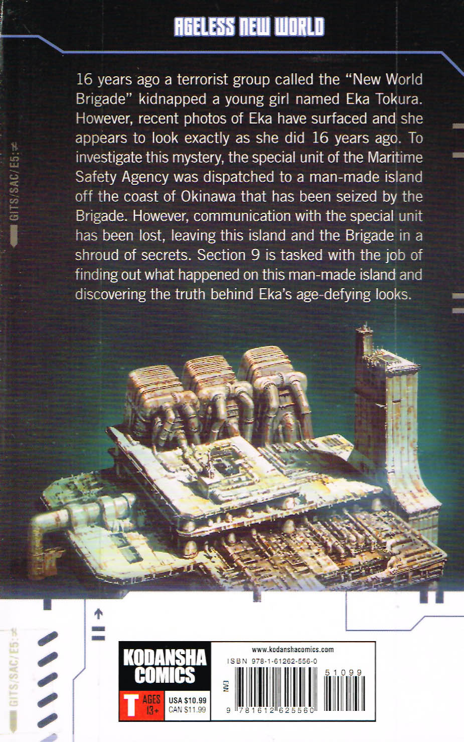 “Volume 5: Ageless new world. 16 years ago a terrorist group called the “New World Brigade” kidnapped a young girl named Eka Tokura. However, recent photos of Eka have surfaced and she appears to look exactly as she did 16 years ago. To investigate this mystery, the special unit of the Maritime Safety Agency was dispatched to a man-made island off the coast of Okinawa that has been seized by the Brigade. However, communication with the special unit has been lost, leaving this island and the Brigade in a shroud of secrets. Section 9 is tasked with the job of finding out what happened on this man-made island and discovering the truth behind Eka’s age-defying looks.”
