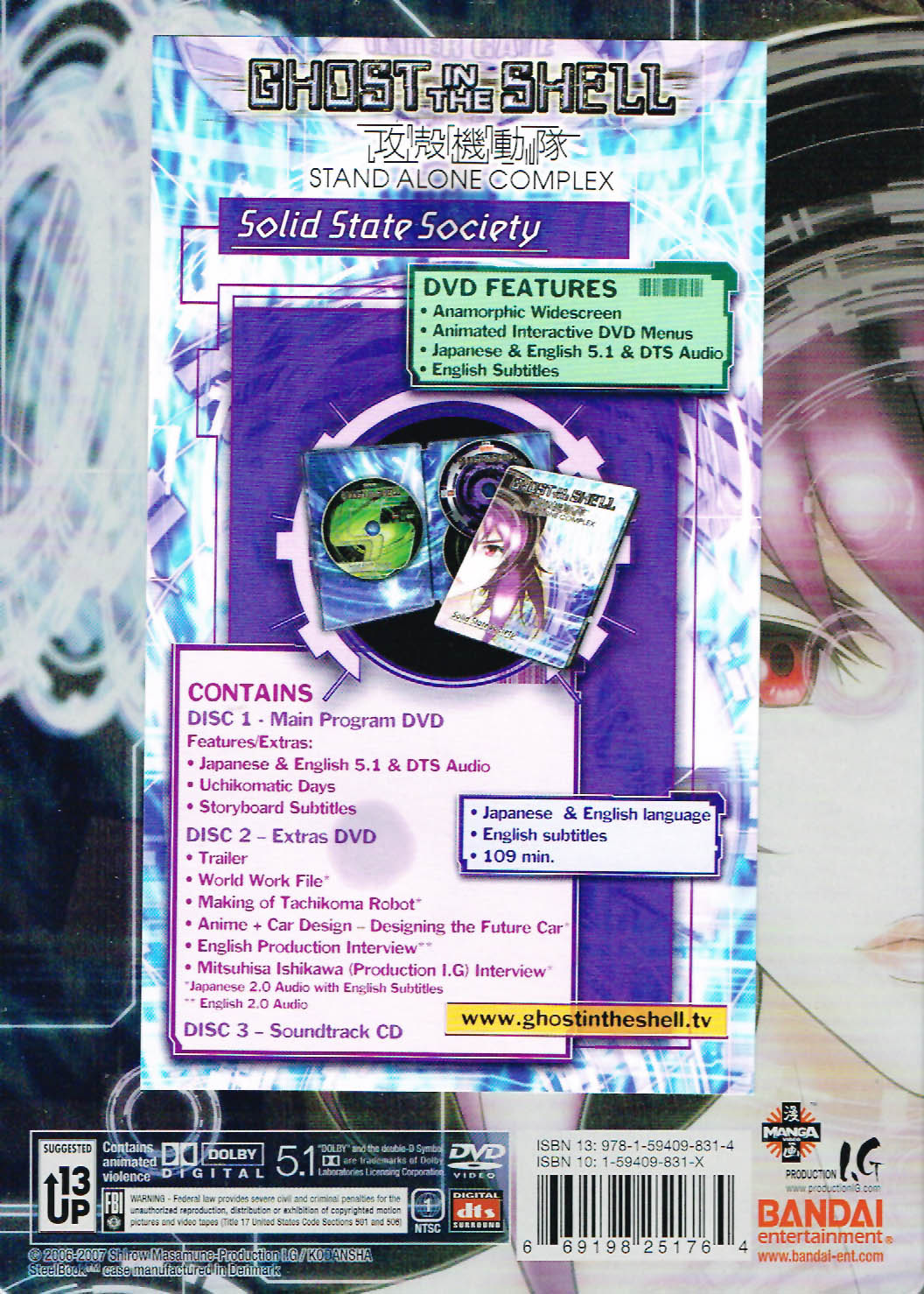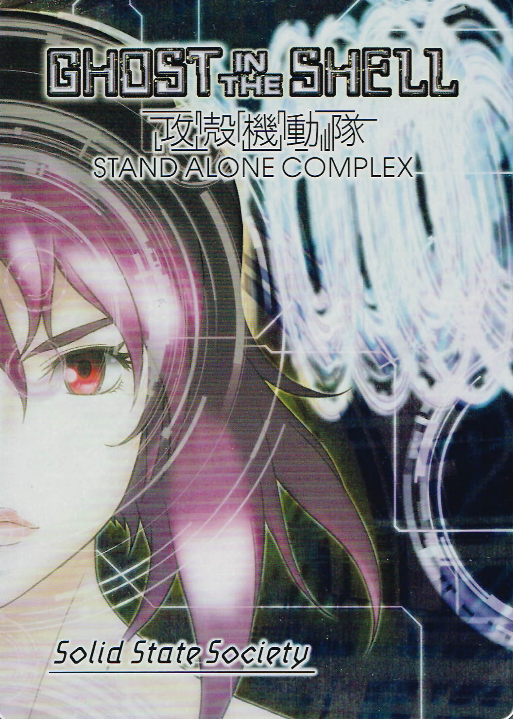 Kôkaku Kidôtai: Stand Alone Complex — Solid State Society. Japan, 2006, 109 min.; Dir.: Kenji Kamiyama; Scr.: Kenji Kamiyama, Shôtaro Suga, Yoshiki Sakurai; Phot.: Kôji Tanaka; Ed.: Junichi Uematsu; Art Dir.: Yusuke Takeda; Char. Des.: Hajime Shimomura, Takayuki Goto, Tetsuya Nishio; Mechan. Des.: Kenji Teraoka, Shinobu Tsuneki; Mus.: Yoko Kanno; Prod.: Production I.G.; Distr.: Bandai, Manga Entertainment; Cast: Atsuko Tanaka (Motoko Kusanagi), Akio Ohtsuka (Batou), Kouichi Yamadera (Togusa), Kazuya Tatekabe (Col. Tonoda), Masuo Amada (Col. Ka Gae-Ru), Osamu Saka (Daisuke Aramaki), Takashi Onozuka (Pazu), Tarô Yamaguchi (Boma), Toru Ohkawa (Saito), Yutaka Nakano (Ishikawa), Yuya Uchida (Takaaki Koshiki), Dai Sugiyama (Proto), Nana Yamauchi (Togusa’s daughter), Yoshiko Sakakibara (Prime Minister Kayabuki). Available on R2 Dvd in Japan (BCBA-2606, 109 min., ¥9800) and on R1 Dvd in North America (Bandai/Manga Entertainment, #25176, Bilingual Dvd, 109 min., $19.98 US [Limited edition: $39.98 US], rated 13+).