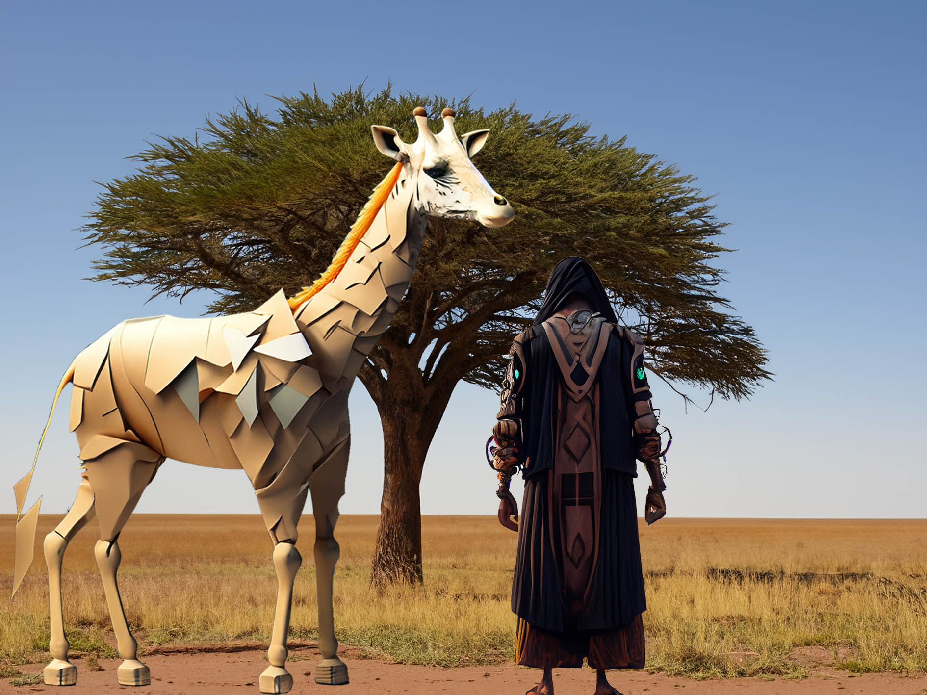 Le Grand MarabouTech traversa les steppes, L’une après l’autre, et y trouva une GIRAfe. Il lui expliqua quelle plante était requise Pour qu’il puisse concocter sa potion. La GIRAfe étendit son long cou Pour que sa tête atteigne les hauteurs.
