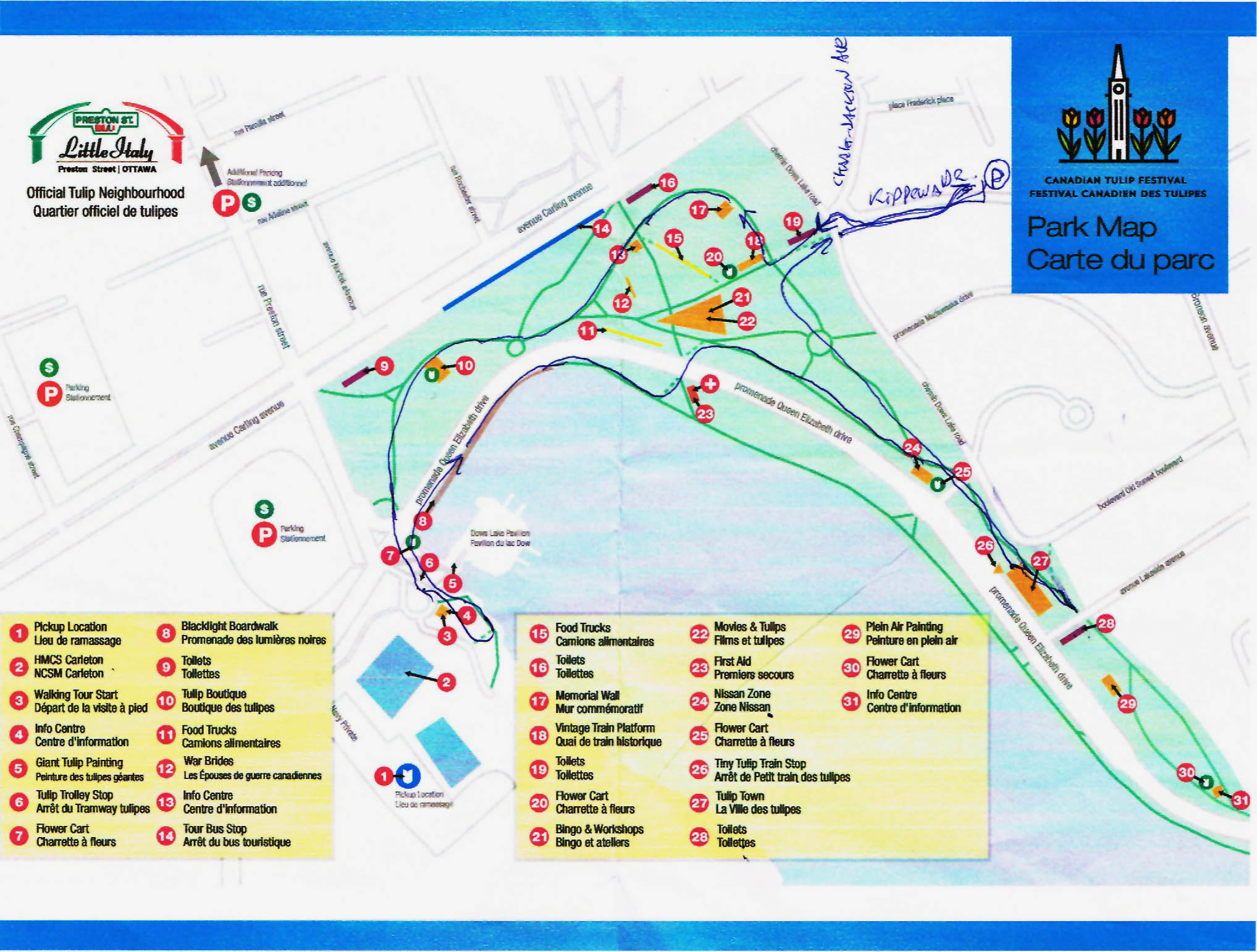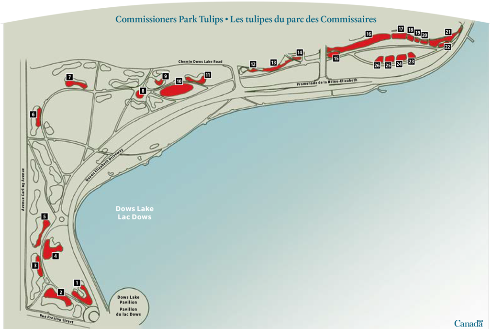 Nous sommes entré dans Ottawa vers midi. Après un bref arrêt dans un Mcdo pour manger notre lunch (nous nous étions préparé des sandwich) avec un café, nous nous sommes dirigé vers le Parc des Commissaires et le Lac Dawe. Il y avait une longue file d’attente pour le stationnement payant, alors nous somme aller du côté Est du lac. On s’est trouvé du stationnement sans trop de difficulté sur Kippewa Drive et sommes entré dans le parc par l’avenue Charles-Jackson. Nous nous sommes alors dirigé vers l’Ouest. Un table d’information distribuait une carte (qui n’est malheureusement pas disponible en ligne et qui n’indique pas les emplacements des plates-bandes de fleurs). Elle ne nous a pas été d’une grande utilité. J’ai navigué mon parcours du parc surtout avec Google Map et j’ai par la suite découvert une carte interactive du jardin qui indique les emplacements des plates-bandes et leur contenu (ce qui est assez utile pour aider à identifier les cultivars de tulipes que je photographiais).