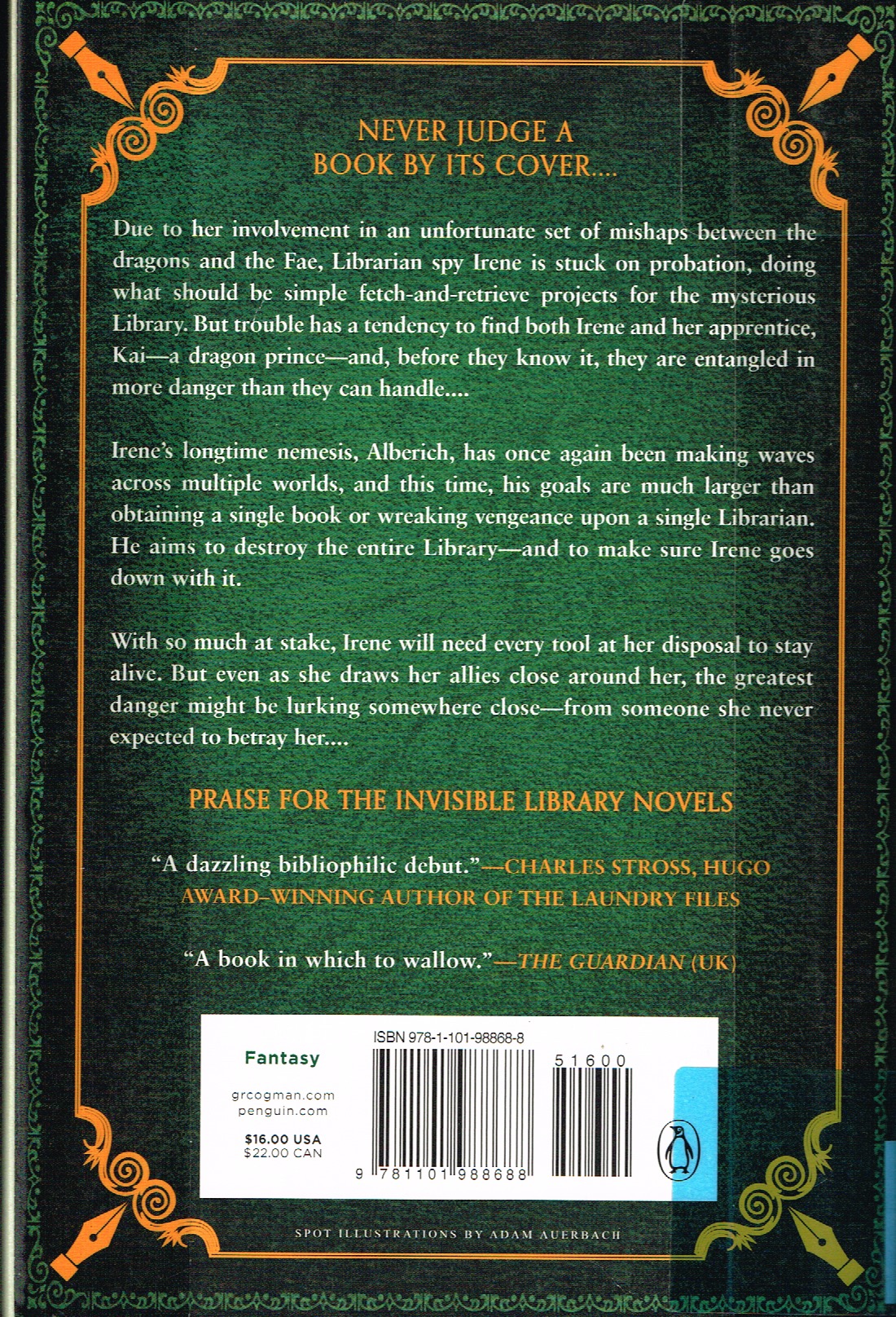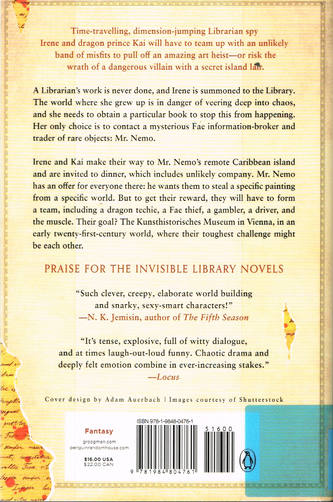Due to her involvement in an unfortunate set of mishaps between the dragons and the Fae, Librarian spy Irene is stuck on probation, doing what should be simple fetch-and-retrieve projects for the mysterious Library. But trouble has a tendency to find both Irene and her apprentice, Kai—a dragon prince—and, before they know it, they are entangled in more danger than they can handle…