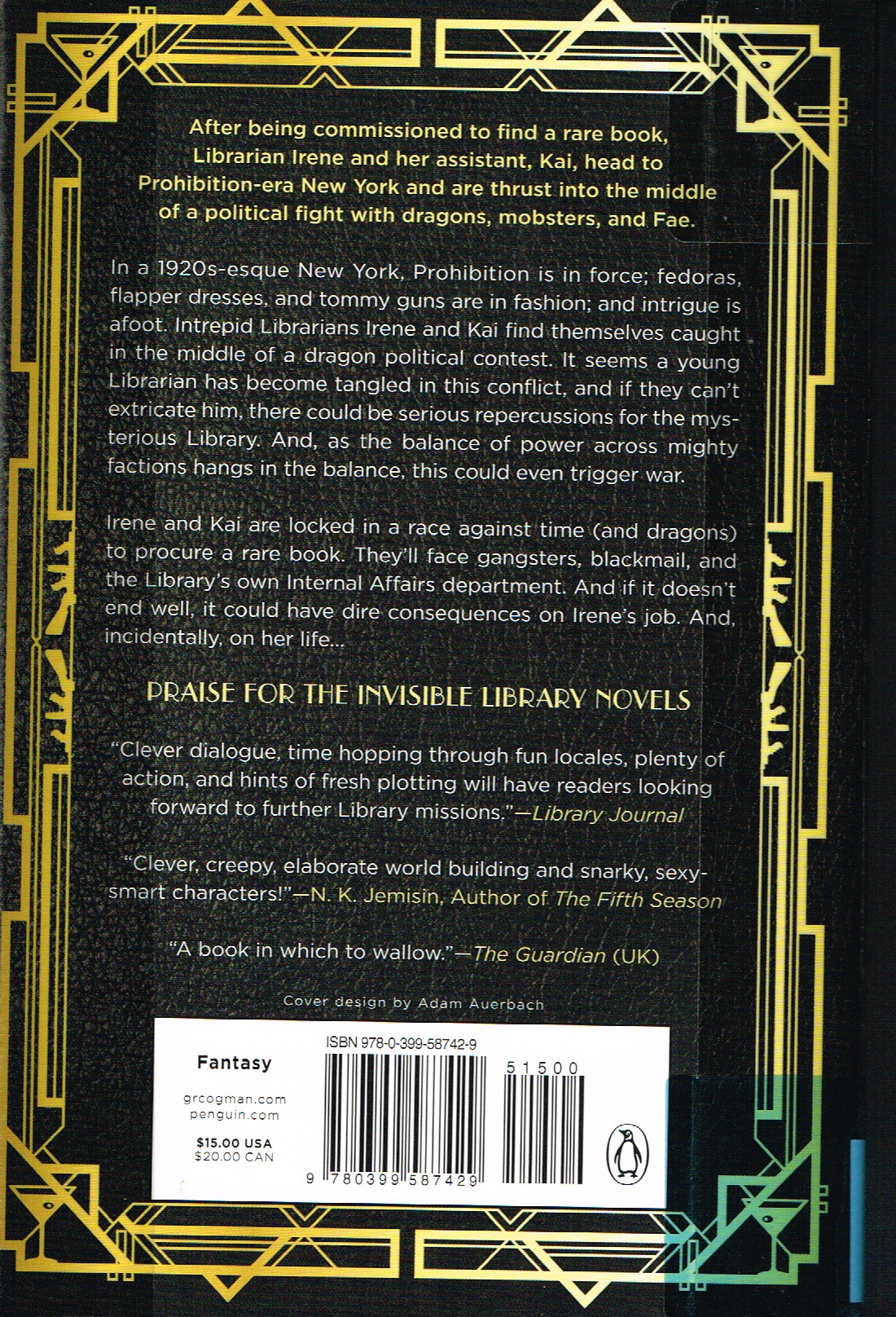 In a 1920s-esque New York, Prohibition is in force; fedoras, flapper dresses, and tommy guns are in fashion: and intrigue is afoot. Intrepid Librarians Irene and Kai find themselves caught in the middle of a dragon political contest. It seems a young Librarian has become tangled in this conflict, and if they can’t extricate him, there could be serious repercussions for the mysterious Library. And, as the balance of power across mighty factions hangs in the balance, this could even trigger war.