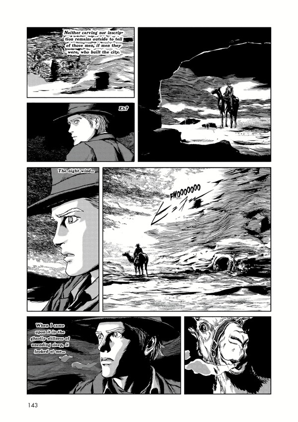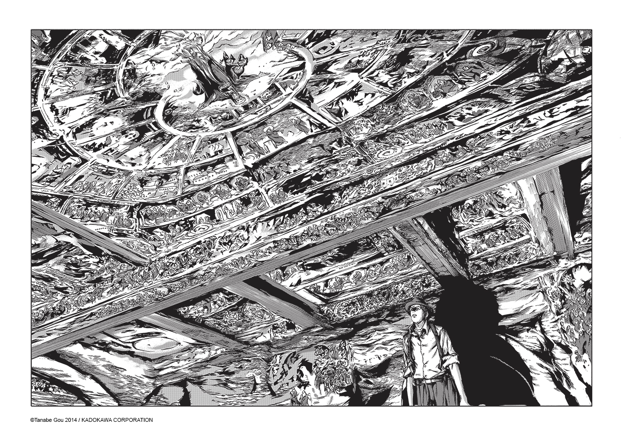 In “The Nameless City”, an explorer discovers an ancient mythic city in the Arabian desert. He enters a cave that brings him down to coffins filled by palaeogean reptilian corpses and frescoes telling of a vanished civilization. Then there are doors opened on a bright light: he finds himself outside, elsewhere, where there are living creatures! Luckily, the doors close… It was written by Lovecraft in January 1921 and published in the November 1921 issue of The Wolverine — it is the first time he mentions the Cthulhu Mythos. Tanabe published his adaptation (「名もなき都」/ Namo naki miyako / “Nameless City”; 32 pages) in the August 2014 online issue of Comic Walker.