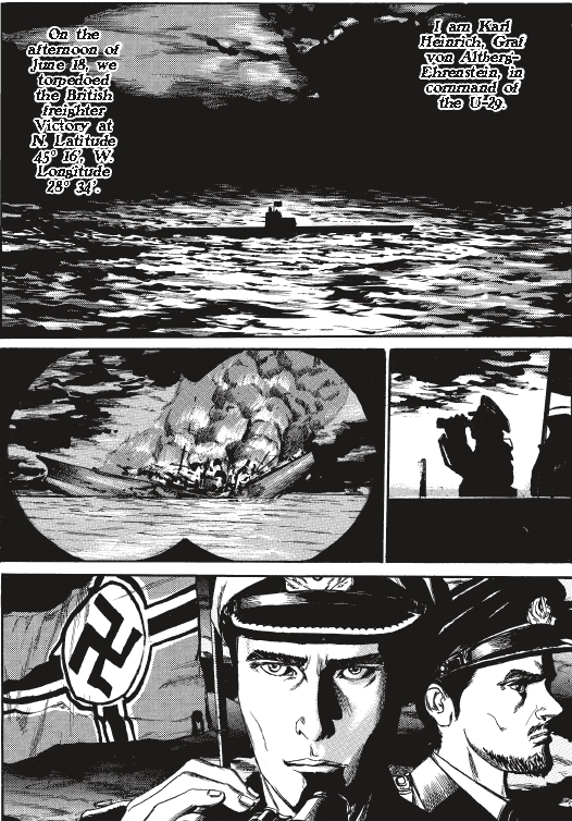 TheHound-Temple-p009In “The Temple”, the lone survivor of a stranded German U-Boat is writing about their discovery of an hellenic-style temple beneath the sea which is calling to them… It was written by Lovecraft in 1920 and published in Weird Tales #24 in September 1925. Tanabe published his adaptation (「神殿」/ Shinden / “Temple”; 64 pages) in the March and April 2009 issues of Comic Beam. As usual, Tanabe adaptation is quite faithful — beside the fact that he moved the timeline from WW1 to WW2.