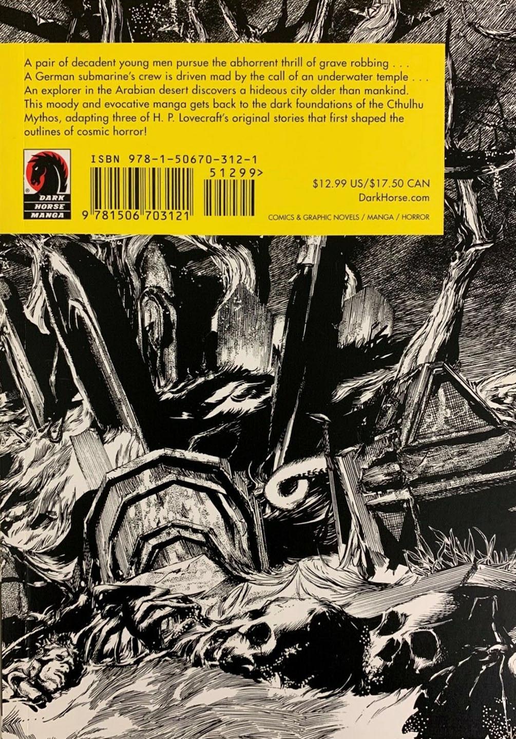 TheHoundTanabe-cov“A pair of decadent young men pursue the abhorrent thrill of grave robbing . . . A German submarines crew is driven mad by the call of an underwater temple . . . An explorer in the Arabian Desert discovers a hideous city older than mankind. This moody and evocative manga gets back to the dark foundations of the Cthulhu mythos, adapting three of H. P. Lovecrafts original stories that first shaped the outlines of cosmic horror!”