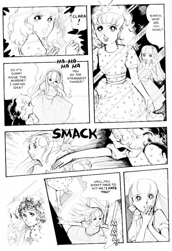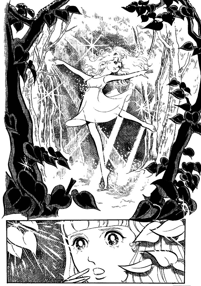 The anthology starts with a short story titled “Bianca” (ビアンカ, 16 p., first published in Shoujo FriendSignature is V” special issue in 1970). Bianca comes to live with Clara’s family for a week because her parents are away for work (actually they are going through a divorce). She is shy but free spirited: she talks to herself in the mirror and dances barefoot in the forest. Clara finds her strange and laugh at her. When Bianca learns what her parents are up to she runs into the forest. Later that night she is found dead. Now an old woman and a painter, Clara has not forgotten her and keep drawing her into her sylvan paintings… stars-3-0