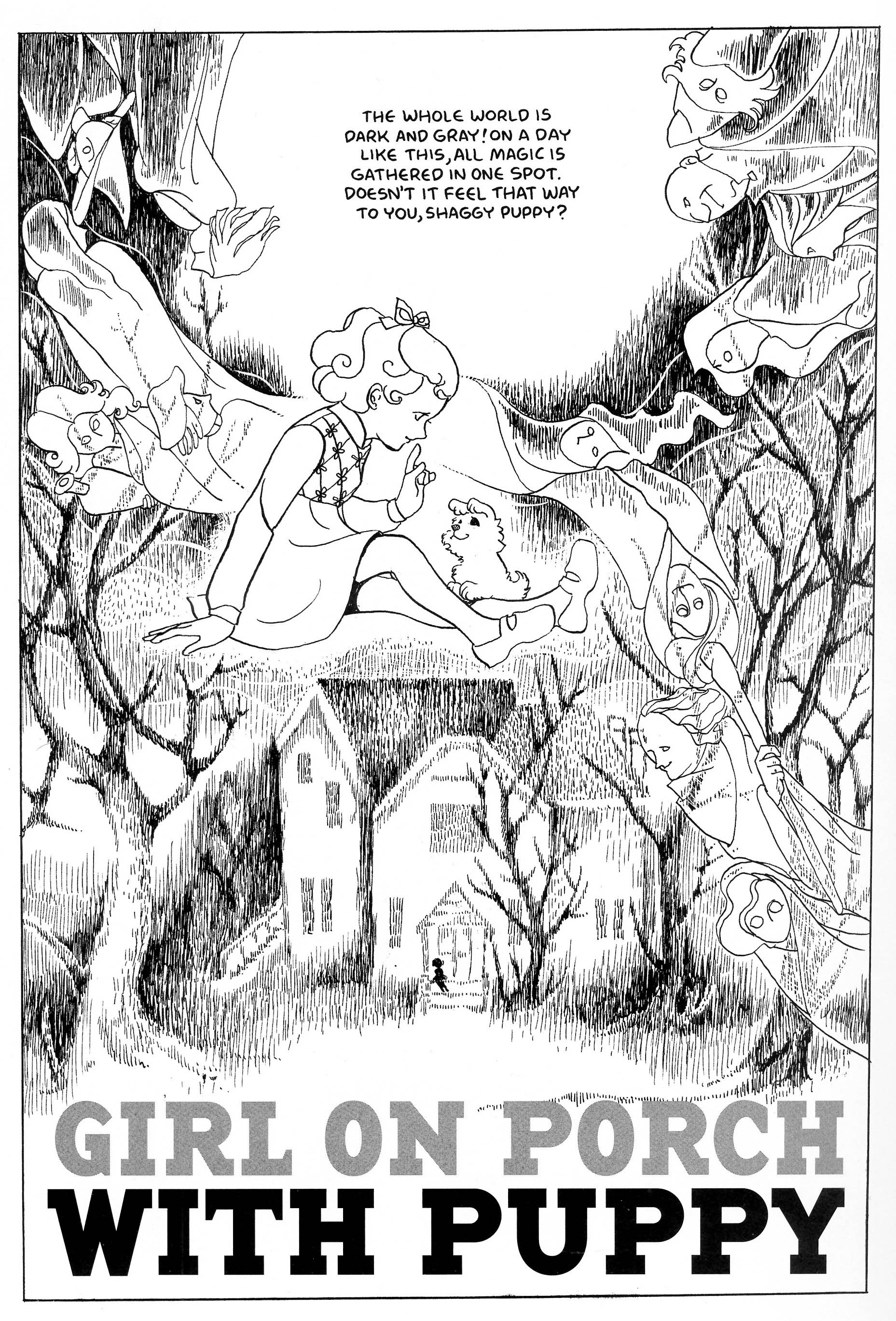 “Girl on Porch With Puppy” (ポーチで少女が小犬と / Pōchi de shōjo ga koinu to, 12 p., first published in COM in January 1971) offers a similar story. A little girl doesn’t behave has it is expected of her: she talks to and kisses her little dog, enjoys the beauty of nature and walking in the rain. She’s told she is too old for such child play. In the end, all the disapproving adults are pointing their index finger at her and she disappears! I guess this story refers to the fact that in Japanese society where conformity is the norm, if you diverge one way or another, you are ostracized and you become invisible to them (if they could they would make you disappeared!). stars-3-5