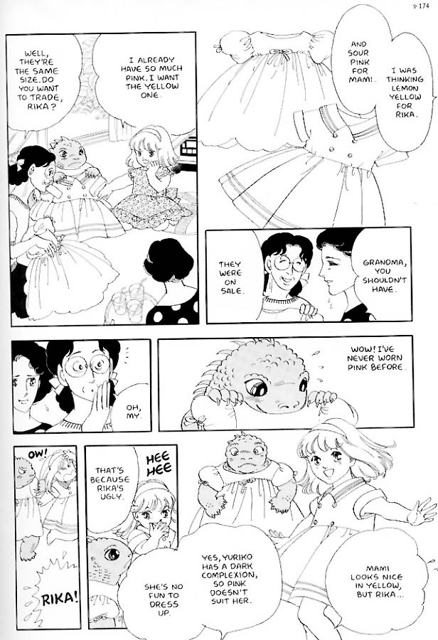 In “Iguana Girl” (イグアナの娘 / Iguana no Musume, 50 p., first published in Petit Flower in 1991), because she’s “different”, a mother sees her baby girl as an iguana (at first I thought it was an allegory for a handicap baby but it seems that it’s simply because the girl was bigger and tomboyish). Rika will grow up complexed. Even if she is very intelligent and beautiful she will see herself as an iguana. However, she realizes that some other people look like animals too and she meets a nice guy that looks like a bull (he’s big and clumsy). When her mother dies, she sees her on her dead bed as an iguana too and imagines the fantasy of her mother being an iguana princess who fell in love with a human and asked a sorceress to transform her into a human. Maybe her mother felt also “different” and transposed her fear into her child? Rika then comes to term with her relationship with her mother. She’s able to move on in her life, marry and have a family of her own… Moto Hagio has confessed that this story is inspired by her own difficult relationship with her mother. stars-4-0