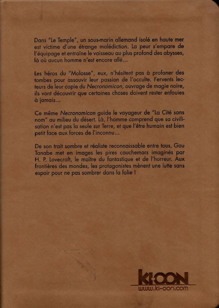 De son trait sombre et réaliste reconnaissable entre tous, Gou Tanabe met en images les pires cauchemars imaginés par H. P. Lovecraft, le maître du fantastique et de l’horreur. Aux frontières des mondes, les protagonistes mènent une lutte sans espoir pour ne pas sombrer dans la folie !”