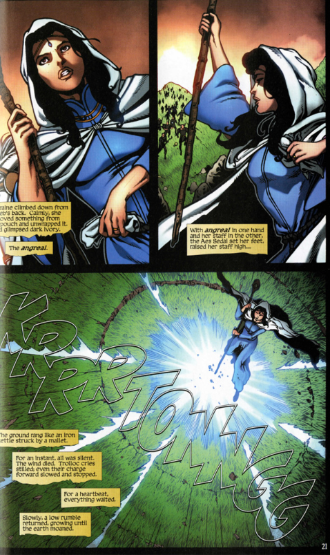 In The Eye of the World: the Graphic Novel, Volume Two, Rand al’Thor, Egwene al’Vere, and their friends flee their home village in the company of Moiraine and her Warder, Lan Mandragoran. Pursued by their enemies, the group seeks sanctuary in Baerlon. Rand’s nightmares grow darker. Moiraine takes Egwene under her wing. Lan warns them to trust no one, but should that distrust extend to Lan and Moiraine as well?”