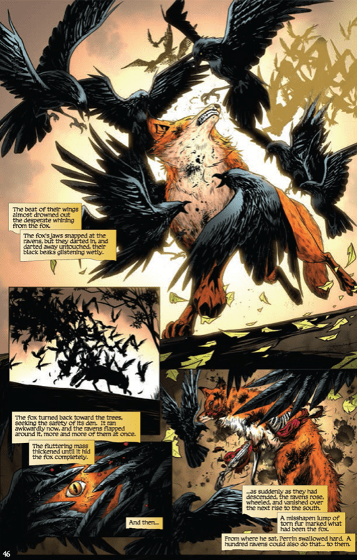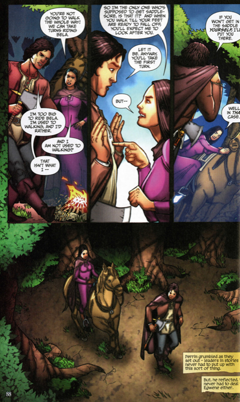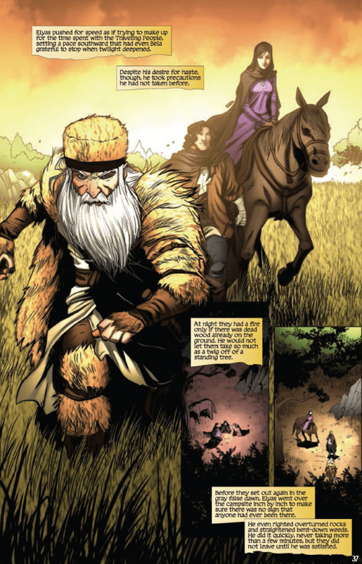 In The Eye of the World: the Graphic Novel, Volume Four, Rand and Mat, Perrin and Egwene, and their friends and fellow travelers separated into three groups and trying to make their way to Caemlyn as quickly as possible. Perrin and Egwene have fallen in with Elyas and his wolf companions. Perrin is both distressed and intrigued when he discovers that he can understand the wolves. When Thom is apparently killed defending them, Rand and Mat are grief-stricken, but they have no time to mourn, for they know that Darkfriends will soon be on their trail. The boys put Thom’s lessons to good use by performing as gleemen to earn their livelihood as they head along the Caemlyn Road. Moiraine begins to teach a reluctant Nynaeve the way of the One Power, challenging much that the Wisdom thought she understood about the world. Soon all three groups find themselves pursued by Darkfriends. Will they be safely reunited or will their enemies begin to pick them off, one by one?”