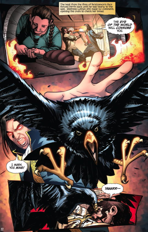 The Eye of the World: the Graphic Novel, Volume Six, Rand al’Thor and his companions—his old friends from Emond’s Field; the brave warrior Lan Mandragoran; and Moiraine, the mysterious and powerful Aes Sedai—have at last been reunited. Their journey in search of the Eye of the World nears its climax as they dare the otherworldly Ways, guided by an Ogier, Loial, and narrowly escape the menace of the soul-stealing Machin Shin. When the group reaches the realm of the Green Man, they believe themselves safe. But two of the Forsaken are waiting for them, ready to attack and to guide their dark lord, Ba’alzamon, to the ones he has been seeking!