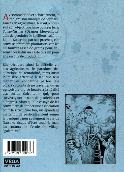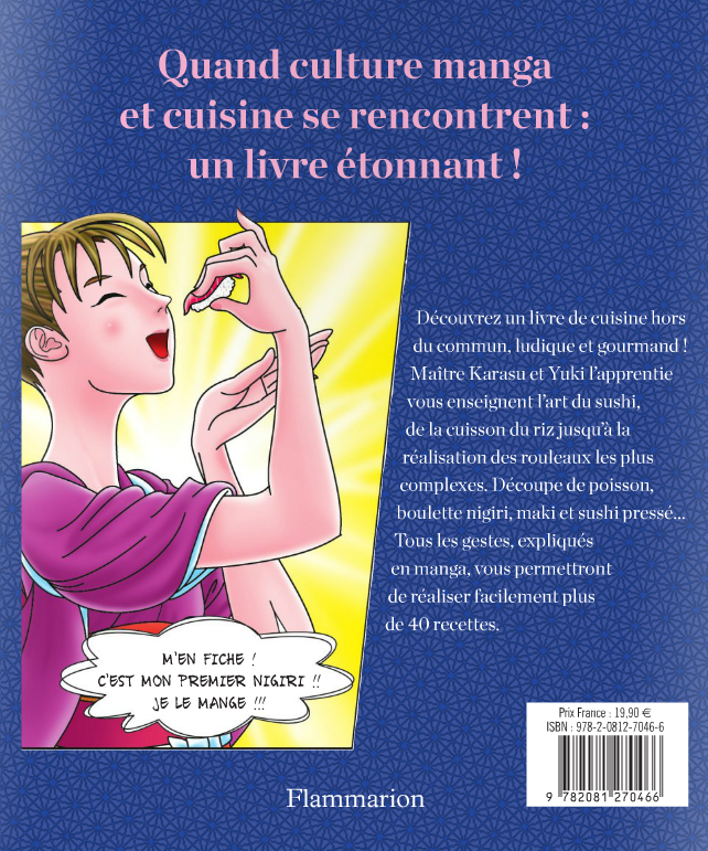 “Quand la culture manga et cuisine se rencontrent: un livre étonnant! Découvrez un livre de cuisine hors du commun, ludique et gourmand! Maître Karasu et Yuki l’apprentie vous enseignent l’art du sushi, de la cuison du riz jusqu’à la réalisation des rouleaux les plus complexes. Découpe de poisson, boulette nigiri, maki et sushi pressé… Tous les gestes, expliqués en manga, vous permettront de réaliser facilement plus de 40 recettes.” [ Texte de