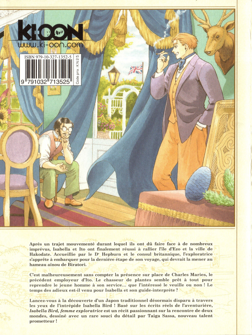 “Le cruel Charles Maries refuse de laisser Ito, son employé aux yeux de la loi, continuer son périple avec Miss Bird. Décidée à récupérer son guide-interprète, l’aventurière fait donc au botaniste une proposition qu’il ne peut pas décliner : le jeune japonais l’accompagnera à Biratori, mais il en profitera pour recueillir des échantillons de plantes. Un présent, plus aucun obstacle ne se dresse entre Isabella et la suite de son voyage ! Il est temps pour elle de rencontrer les mystérieux Aïnous, ce peuple à la culture bien particulière et dont l’Occident sait si peu de choses…