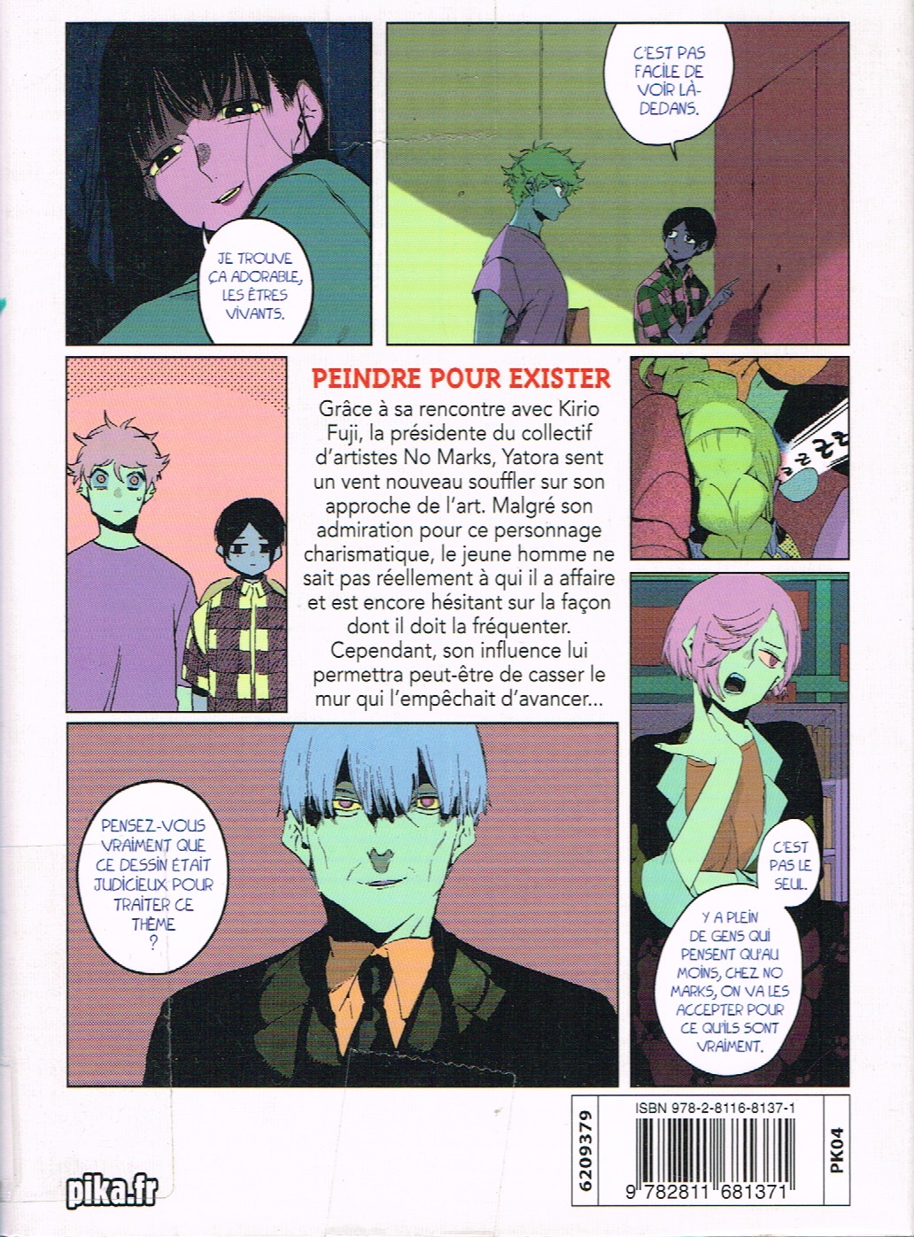 BluePeriod-13-cov“Grâce à sa rencontre avec Kirio Fuji, la présidente du collectif d’artistes No Marks, Yatora sent un vent nouveau souffler sur son approche de l’art. Malgré son admiration pour ce personnage charismatique, le jeune homme ne sait pas réellement à qui il a affaire et est encore hésitant sur la façon dont il doit la fréquenter. Cependant, son influence lui permettra peut-être de casser le mur qui l’empêchait d’avancer…”