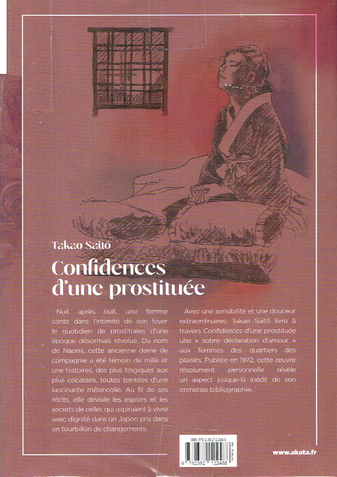 Confidences d’une prostituée, par Takao Saitô. Rancon: Akata (Coll. Héritage), octobre 2023. 340 pages, 14.7 x 21.0 cm, 16.99 € / 31,95 $ Can, ISBN 978-2-38212-248-8. Pour un lectorat jeune adulte (16+, sexe, nudité). Sens de lecture japonais (de droite à gauche). Extraits disponibles. stars-3-5