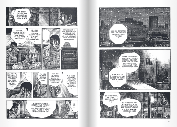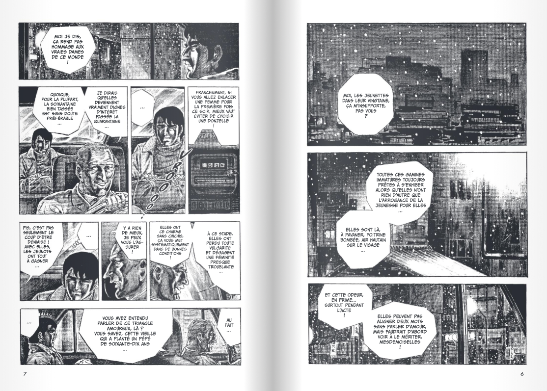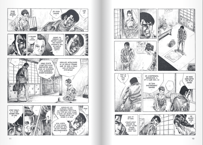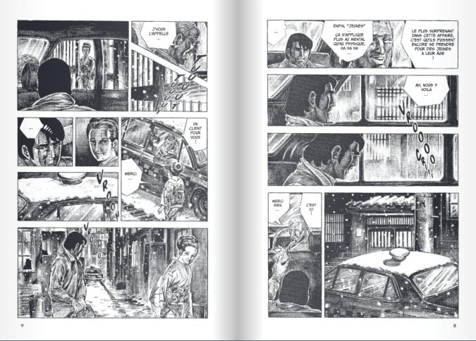 Ce volumineux manga nous offre quatre histoires (“Samurai non grata” [144 p.], “Les 25 heures du Mans” [56 p.], “Les 8%” [130 p.] et “Cent yens de solitude” [119 p.]) qui racontent les mésaventures d’un commerçant qui sert d’intermédiaire dans des affaires louches, de son ami ancien mercenaire qui est le gérant de son appartement parisien et d’une modèle vietnamienne qui croise leur chemin de temps en temps. On y retrouve beaucoup d’action mais la complexité du récit et la narration confuse rend la lecture plutôt pénible. Heureusement, il y a le superbe dessin de Taniguchi, dans un style clair et précis, qui sauve un peu la situation et rend la lecture du manga un peu plus agréable. À lire seulement pour les amateurs de Taniguchi…