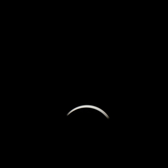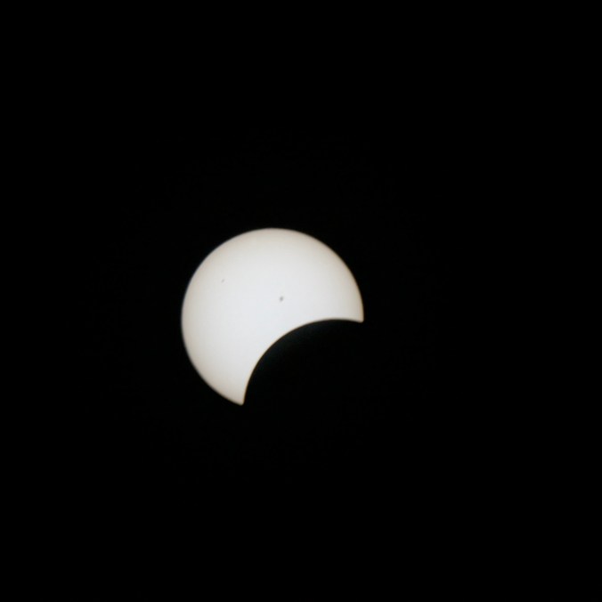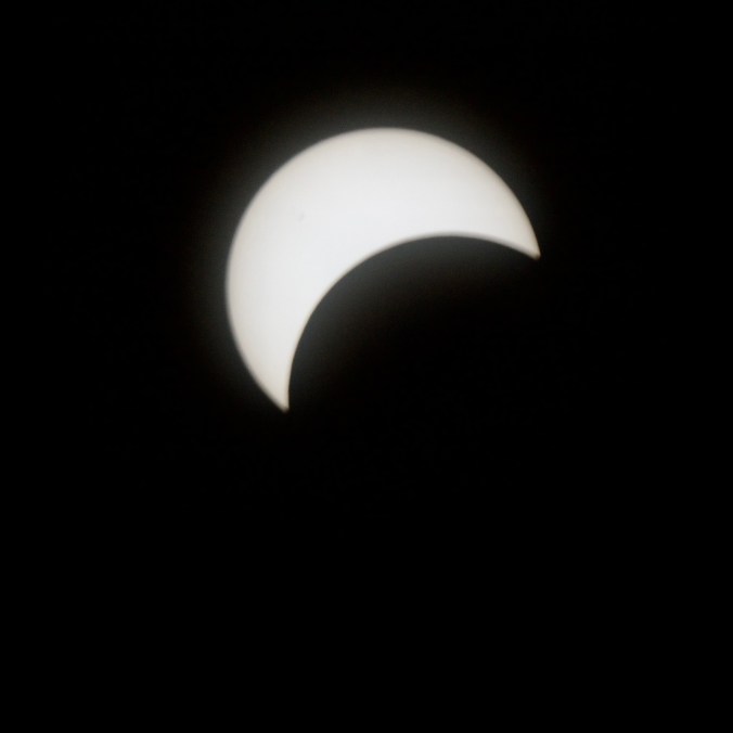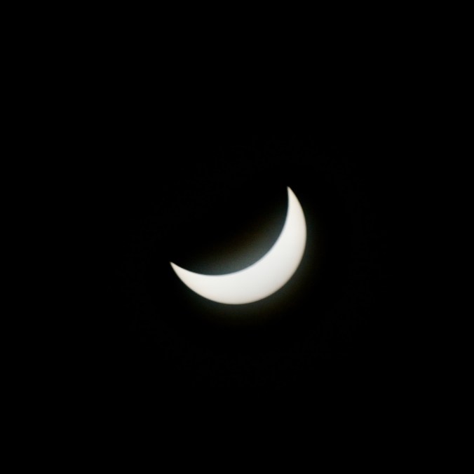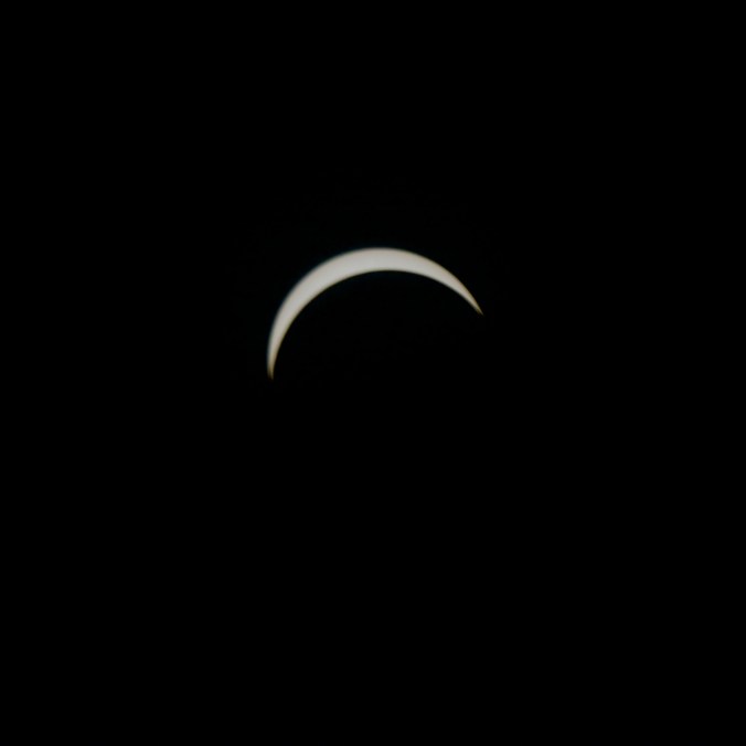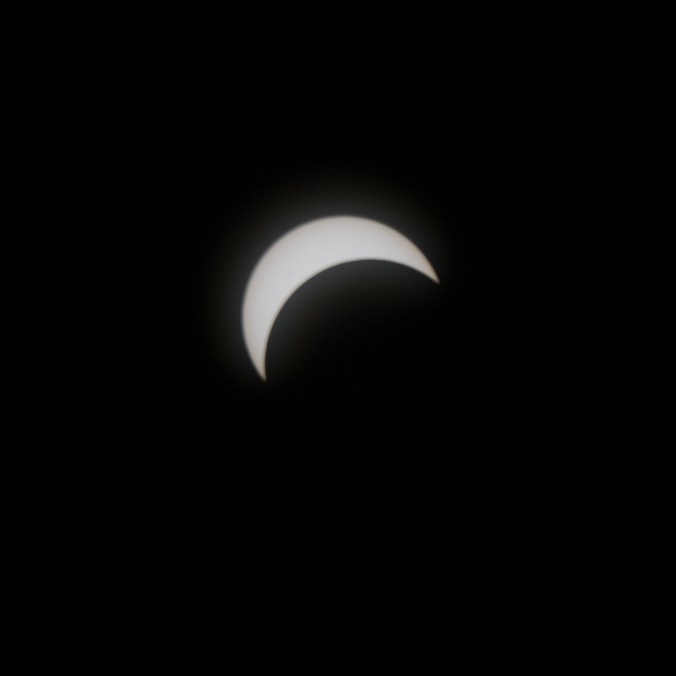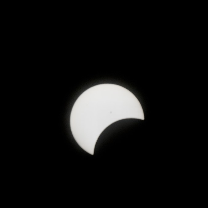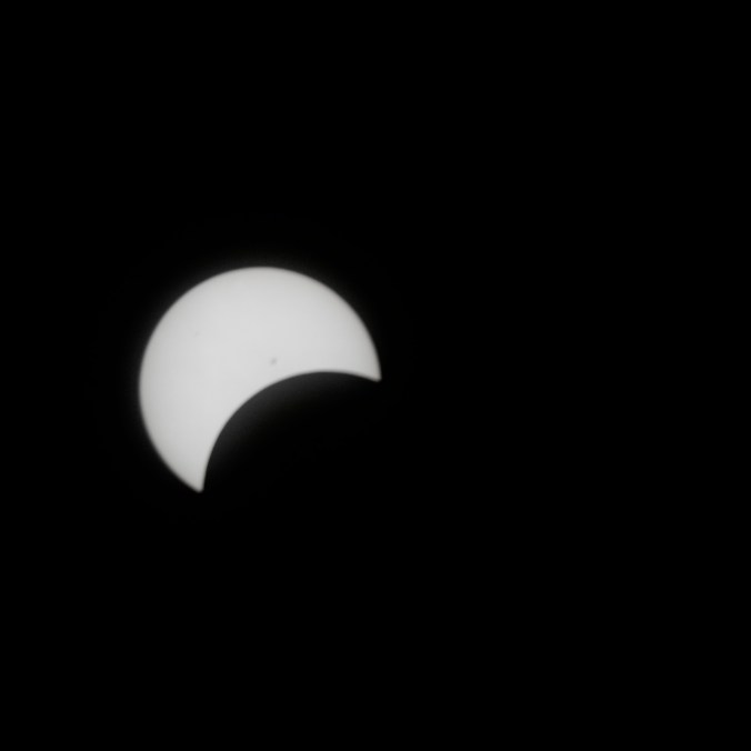 Voici le résultat de ma tentative de photographier l’éclipse solaire totale du 8 avril 2024. J’ai utilisé ma Nikon D3300 réglé en ISO 400. J’ai eu beaucoup de difficulté au début à cadrer le soleil dans l’objectif puis à trouver les meilleurs paramètres. Les photographies sont prises à interval d’environ cinq minutes. Pour la première image, j’ai utilisé un objectif Tamron 300 mm f5.6 avec un filtre ND 1000. Comme le filtre était insuffisant, j’ai dû utiliser une vitesse d’obturation plus haute (1/3200 seconde). Toutes les autres images utilisent un objectif Optera 500 mm f6.3 avec un filtre plus opaque Nano-K ND1000000. J’ai varié la vitesse d’obturation (entre 1/80 s et 1/15 s) en fonction du niveau de luminosité du croissant solaire, mais les photos prises à basse vitesse sont un peu plus floues à cause du mouvement inévitable de la caméra malgré le trépied. Sur les deux premières images prises avec l’Optera, on remarque deux petites taches solaires. J’ai manqué le moment de totalité, car, étant légèrement en dehors de la zone de totalité, ce moment a été très bref et il aurait fallu que j’enlève le filtre de l’objectif pour le capturer et je n’ai pas eu le temps de le faire. Je suis tout de même assez satisfait du résultat.