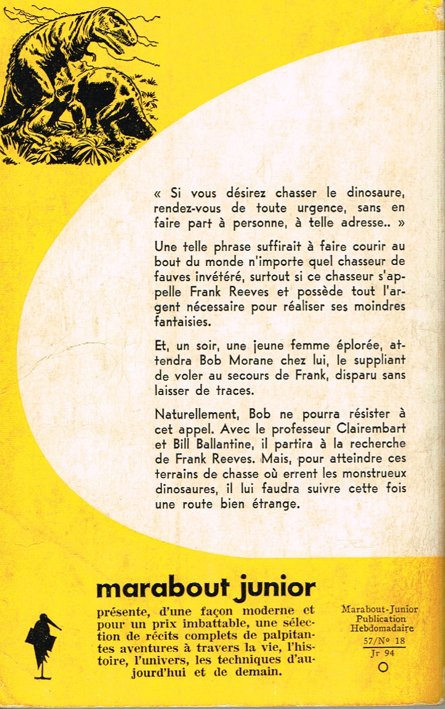 Pour commémorer la disparition de Henri Vernes, à l’instar de mon neveu, j’ai décidé de relire quelques unes des aventures de Bob Morane. J’en ai donc choisi une au hasard dans ma collection (je ne les ai pas tous mais j’en ai tout de même une cinquantaine — et j’ai dû lire les cent-cinquante premiers volumes sur une collection qui en compte deux-cent-sept). Je suis tombé sur un vieux volume de Marabout Junior, aux pages jaunies et craquantes, publié en 1957: Les chasseurs de dinosaures… Il semble que ce soit l’édition originale, le vingtième volume de la série (et le quatre-vingt-quatorzième de la collection Marabout Junior).