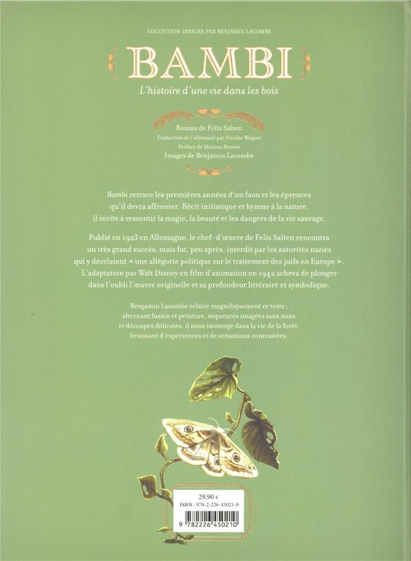 Considéré comme un conte pour enfant (9 à 12 ans) à cause du film de Disney (sortie en 1942) ce livre est actuellement un roman animalier pour adulte écrit en 1923 par Félix Salten, un auteur autrichien. Le titre original est Bambi: Eine Lebensgeschichte aus dem Walde (le nom “Bambi” viendrait de bambino, qui veut dire “enfant” en italien). Étrangement, il fut banni par les nazis qui y voyaient une allégorie politique sur le traitement des juifs en Europe. Ce symbolisme n’est pas vraiment évident à la lecture mais cela reste tout de même un long récit dramatique, trop sérieux et volumineux pour être approprié pour un jeune lectorat. Malgré une histoire qui transpose clairement des connotations autobiographiques et un ton sombre qui reflète l’inquiétude de sa communauté, le récit de Salten en bout du compte est empreint de pacifisme et d’optimisme. Tout cela est bien remis en contexte par les préfaces de Maxime Rovere et de Benjamin Lacombe ainsi qu’une postface qui commente la nouvelle traduction par Nicolas Waquet.