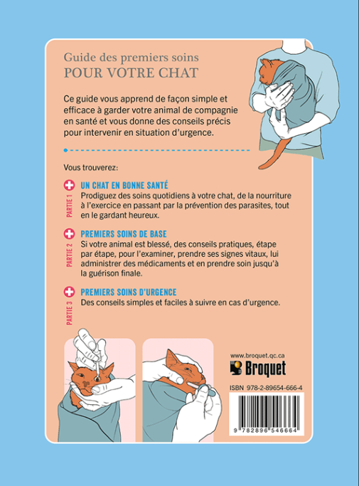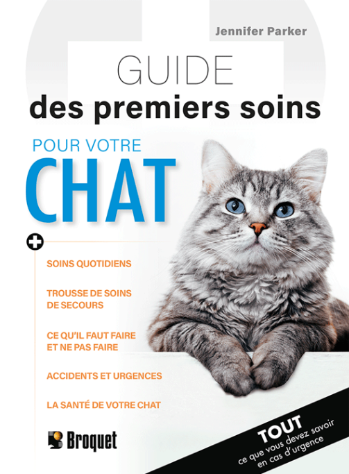 Guide des premiers soins pour votre chat : tout ce que vous devez savoir en cas d’urgence, par Jennifer Parker. Paris: Broquet, 2021. 192 pages, 23 cm, $C 24.95, ISBN 978-2-89654-666-4, Pour lectorat adolescent (12+). [Voir aussi la couverture arrière] stars-4-0