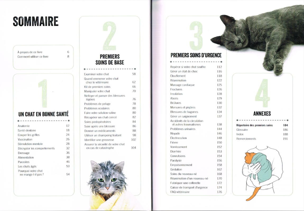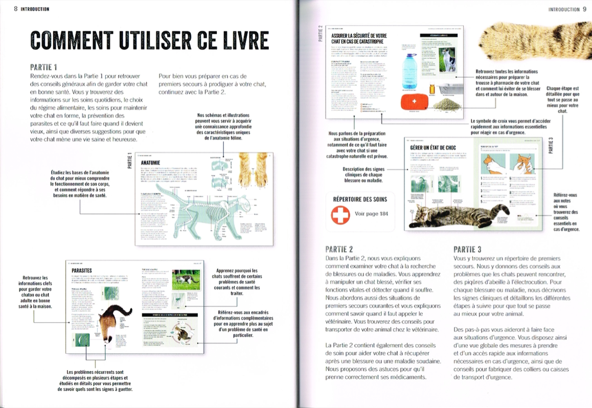 GuidePremiersSoinsChat-covComme beaucoup d’ouvrages du genre, celui-ci vous apprendra de façon simple et efficace à garder votre animal de compagnie en santé (voir “comment utiliser ce livre”). Il est divisé en quatre parties (voir sommaire): “Un chat en bonne santé“ (anatomie, vaccination, dressage, alimentation, etc.), “Premiers soins de base” (manipulation, nettoyage et pansage, médicament, etc.), “Premiers soins d’urgence” (réanimation, fractures, morsures, empoisonnement, etc.), et “Annexes” (répertoire des premiers soins, glossaire et index).