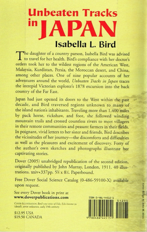 Unbeaten tracks in Japan by Isabella L. Bird. New York: Dover, 2005. 336 pages, 16 x 22 cm, $14.95 US, ISBN 9780486445151, Pour lectorat adolescent (12+). stars-3-0