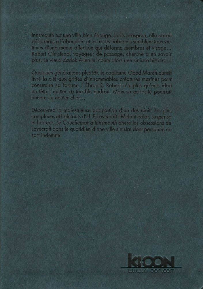 CauchemardInnsmouth-2-cov“Innsmouth est une ville bien étrange. Jadis prospère, elle paraît désormais à l’abandon, et les rares habitants semblent tous victimes d’une même affection qui déforme membres et visage… Robert Olmstead, voyageur de passage, cherche à en savoir plus. Le vieux Zadok Allen lui conte alors une sinistre histoire…