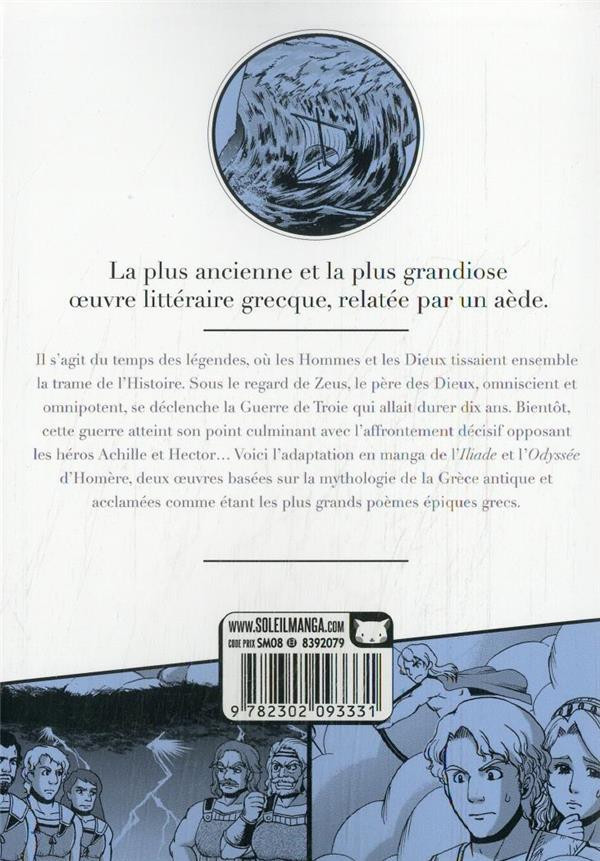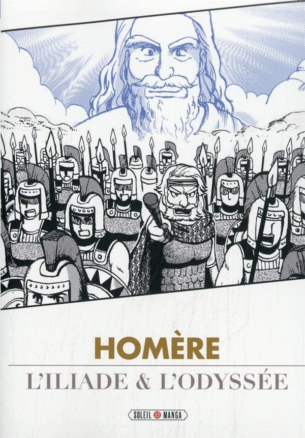 L’Iliade & L’Odyssée (ホメロス / イリアス・オデュッセイア) est l’adaptation en manga de deux poèmes épiques que l’aède grec Homère aurait composé au VIIIe siècle AEC. Il a été publié par l’éditeur japonais East Press en octobre 2011 au sein de la fameuse collection Manga de dokuha (まんがで読破 / lit. “lire à travers les mangas”) — le #94 sur 139. Celle-ci a été créé par le collectif “Variety Art Works” dans le but de rendre accessibles au grand public (sous forme d’adaptations en manga) des chefs-d’œuvres de la littérature qui sont rarement lus. Toutefois le groupe Team Banmikas, qui a succédé à Variety Art Works, a résilié le contrat de distribution avec l’éditeur East Press et la collection a cessé de paraître. Cependant certains titres demeurent disponible en format électronique. Les Éditions Soleil ont entrepris de traduire en français, dans leur collection “Classiques”, une vingtaine de ces adaptations comme La Divine comédie de Dante, Ulysse de James Joyce, À la recherche du temps perdu de Marcel Proust, Ainsi parlait Zarathoustra de Friedrich Nietzsche, Du contrat social de Jean-Jacques Rousseau, Le prince de Machiavel, Le rouge et le noir de Stendhal et, le titre le plus récent paru en juin 2023, le Kamasutra de Vatsyayana. Malheureusement, si ces adaptations constituent une bonne introduction à ces oeuvres classiques, elles sont dessinées dans un style qui est généralement plutôt grossier. J’ai déjà parlé de cette collection et commenté plusieurs de ses titres (Les mots de Bouddha, L’interprétation des rêves, Guerre et Paix, Manifeste du parti communiste, Les misérables, Le Capital, Le rouge et le noir, À la recherche du temps perdu, et même La Bible: ancien et nouveau testament).