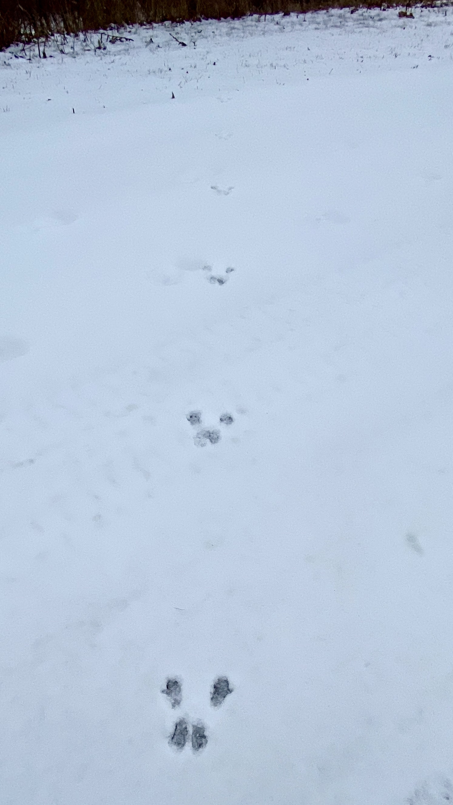 À ma grande surprise, lors d’une de mes promenades (le 30 décembre, vers 13h), j’ai découvert une chose que je n’avais jamais vue dans le parc: ce qui semble être des traces de lièvres. Cela ne ressemble ni à des traces d’écureuil, ni à des traces de chats… cela ne peut être qu’un lièvre (cf. La Presse+, FCF, Nature-Action, ANF). Je n’aurai jamais cru qu’il y en avait dans le parc Frédéric-Back. Ils doivent avoir leur terriers dans les collines de la périphérie boisée…