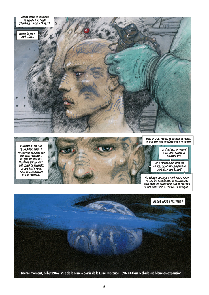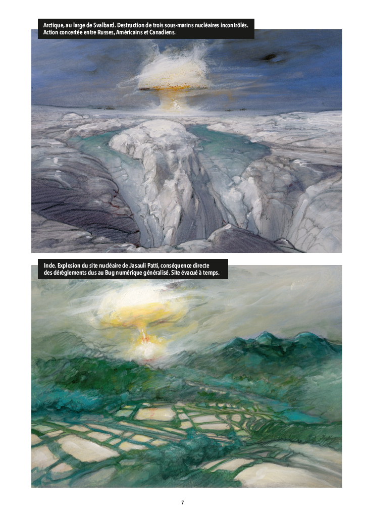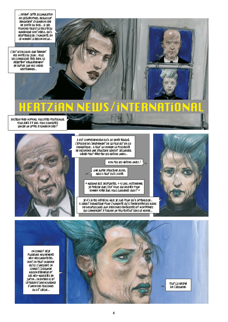 Le récit se poursuit… (voir mes commentaires des premiers et second volumes). 2042. Que se passerait-il si toute la technologie qui contrôle notre monde, nos villes, nos vies, notre corps même (par des implants), cessait subitement de fonctionner? Alors que la planète est plongée dans le chaos, Kameron Obb (seul survivant d’une expédition vers Mars) lui semble le récipiendaire de TOUTES les mémoires électroniques du monde. Cela en fait un homme recherché et convoité. Prisonnier d’un groupe Néo-Marxiste-Féministe, il est kidnappé cette fois par la tsarine de la Nouvelle Russie Sibérienne. Tous veulent qu’il rétablisse leur système électronique… Une nébulosité bleue approche de l’orbite terrestre… Pendant ce temps, sa fille Gemma, sauvée par Junia, la compagne de fortune de Obb, retourne à Paris pour tenter de sauver le monde du chaos. Junia tente de libérer Obb d’une haute tour au large de Barcelone, mais il n’y est plus et elle est capturé par les Néo-Marxiste. Obb s’évade de Sibérie à bord d’un chasseur Sukhoi-77 pour rejoindre Gemma et sauver la présidente française de ses implants. Puis il va libérer Junia. Un nouveau groupuscule entre en jeu, le STALLER (STAline-hitLER, des néo-fascistes). Ils ont capturé le millionaire Awden Marxoe (le patron de Obb) qui semble en possession d’une information capitale sur le Bug. Pour la première fois, Obb est contacté par l’Entité Bleue… Quelle sont les véritables intentions de cette entité? Aurait-il été manipulé par une force malveillante? Deux courants bleus semblent lutter en lui. Il perd le contrôle du Sukhoi et il se retrouve avec Junia sur une plage de Lampedusa en Libye. Il a de la fièvre, tombe dans le coma. Il se réveil amnésique!
