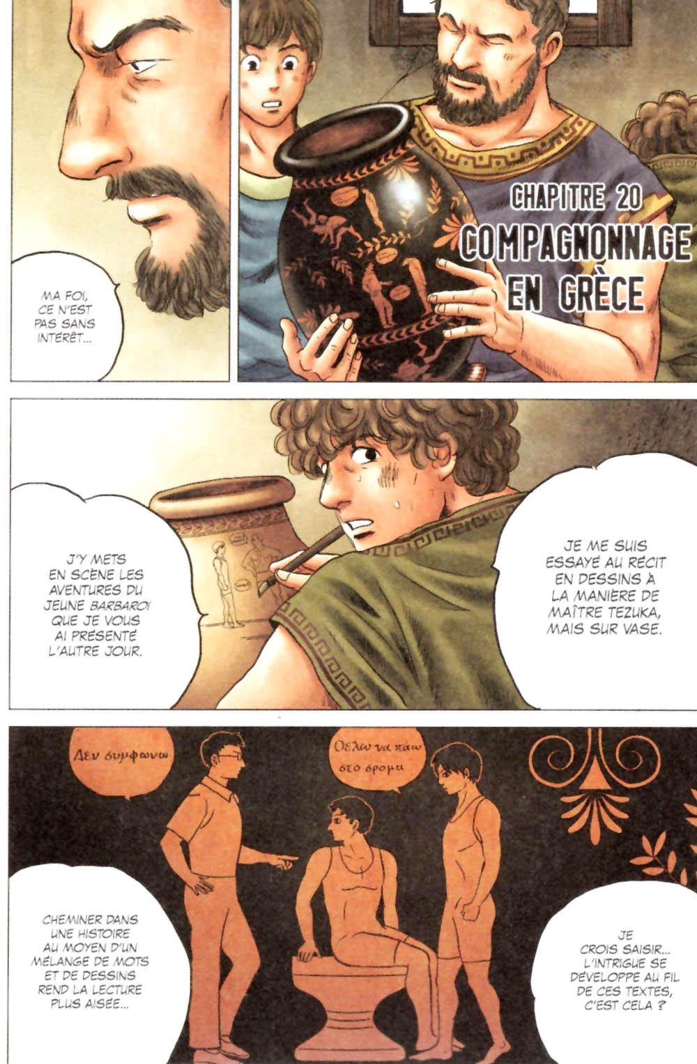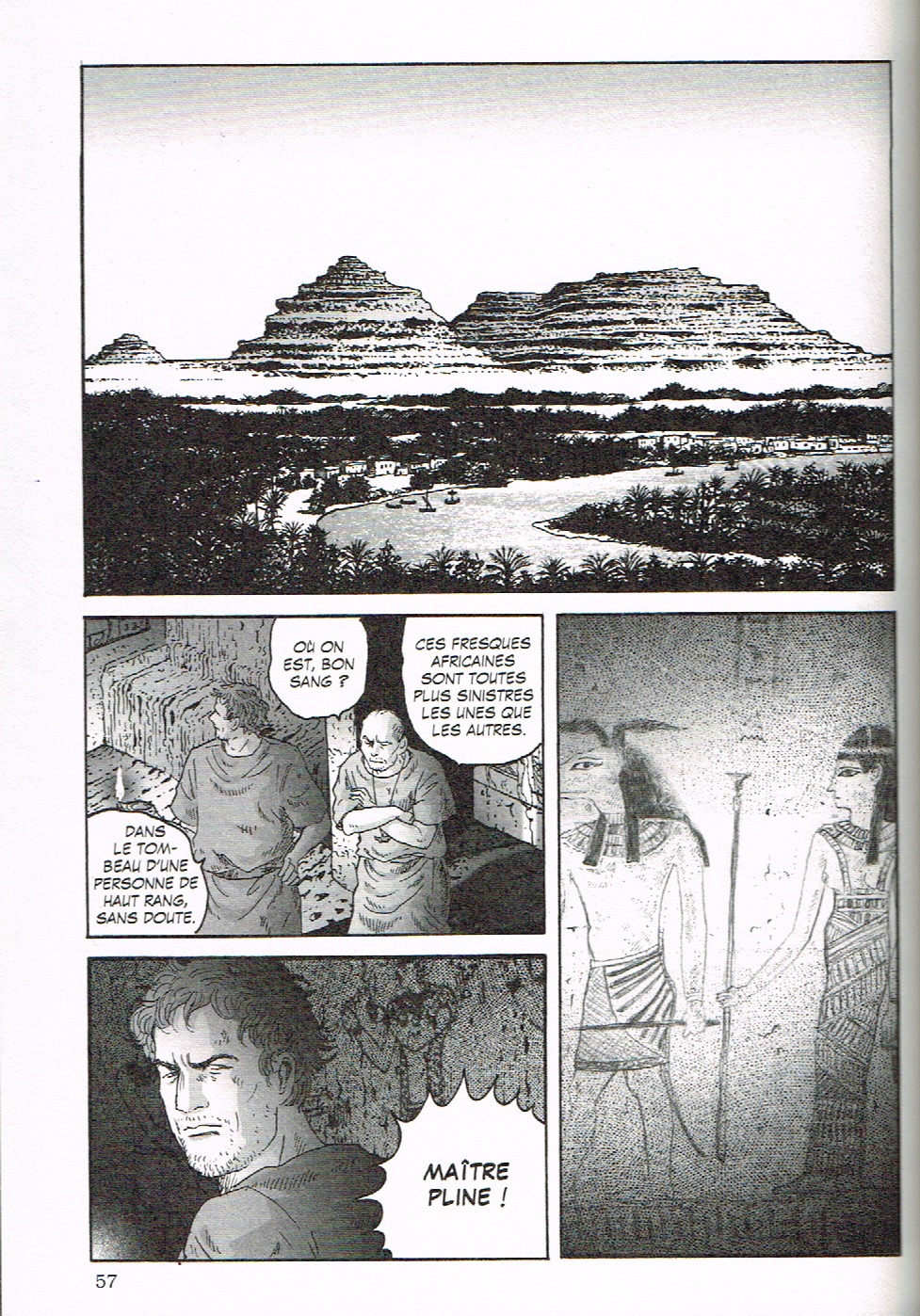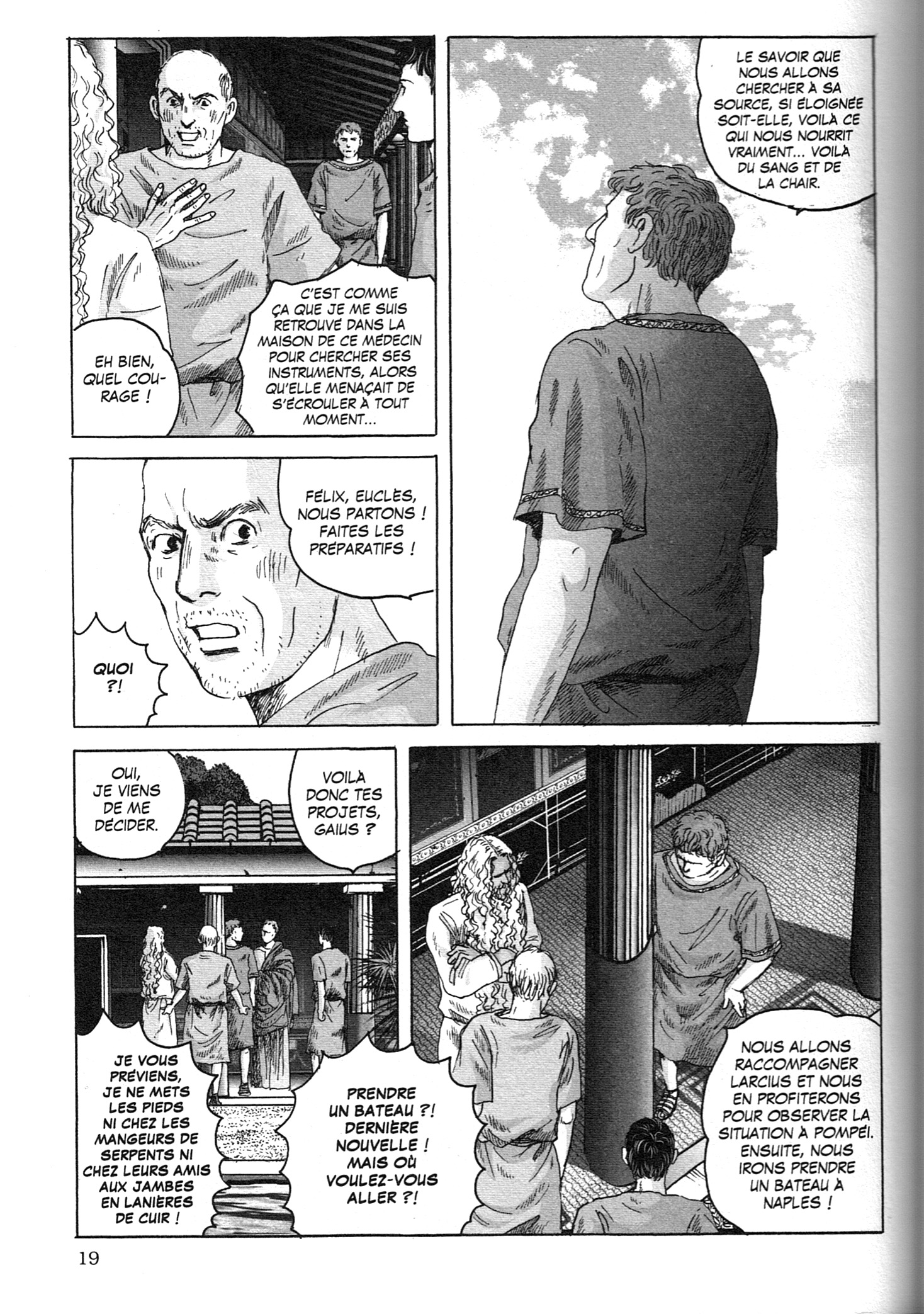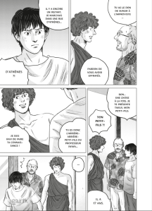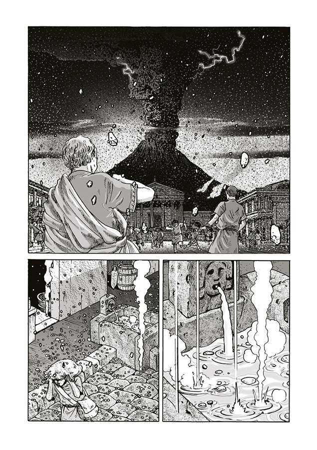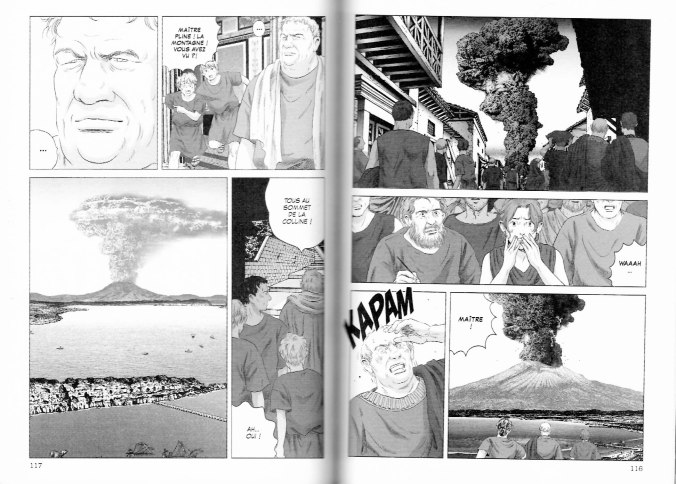 Ce second tome, s’il nous offre beaucoup moins d’action que le premier, n’en est pas moins intéressant car il approfondit de beaucoup notre connaissance des protagonistes. Euclès découvre la maison (remplit de manuscrits!) de son nouveau maître, Pline. Celui-ci souffre grandement de l’asthme mais se méfie beaucoup des médecins. Il finira cependant par se soumettre au traitement du médecin grec Silénos, qui lui recommande surtout l’air pur de la Campanie. Euclès tombe amoureux d’une jeune esclave, Plautina, qu’il a rencontré par hasard, mais celle-ci est aussi tombé dans l’oeil de l’empereur Néron! Celui-ci se sent un peu égaré sans les conseils de son précepteur, Sénèque, qu’il a exilé. On y découvre une image plus humaine de Néron, qui apparait moins comme un tyran qu’un jeune homme cultivé mais moralement faible. Poppée, qui n’est pas très aimée du peuple, se fait lancer des pierres. Elle annonce à Néron qu’elle est enceinte, ce qui le convainc finalement de la marier et de régler le sort d’Octavie. Felix, le garde du corps un peu frustre de Pline, a une famille à Rome mais sa femme se plaint de ses absences prolongées et surtout des conditions de vie difficile dans les insulae romaines. Alors Pline leur offre de s’installer dans l’une de ses maisons. Mais le personnage le plus important de ce tome, c’est sans doute Rome elle-même alors que l’on découvre plus en détails ses bas fonds et ses lupanars!